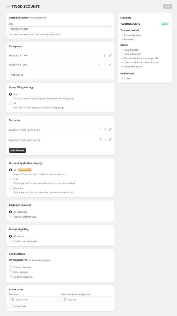 Now, the “All” application strategy is still in beta, and has some quirks, like having only the first message show up. I understand this is a limitation from the Shopify Discounts API at the moment, so it should be fixed soon enough. The actual discount allocation works fine, which is what’s important!